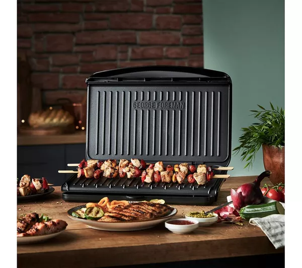Let the fat drain away. The 25820 Large Fit Grill has the George Foreman signature clip-on drip tray to collect all the unnecessary fat. Then you can just rinse it and pop into dishwasher. Plates are easy to clean too, just wipe the non-stick surface.